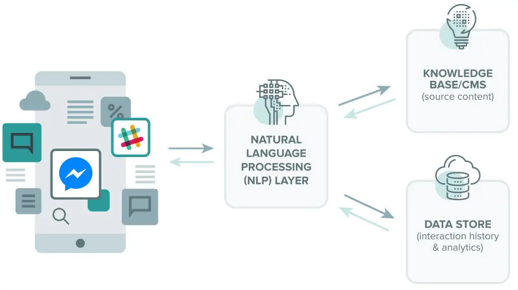 While there’s more to it than this, AI chatbots communicate through channels like your website, socials, mobile app, etc., which are linked to a knowledge base and all connected data sources through the NLP layer.